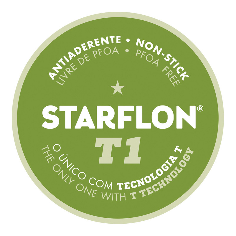 Aluminio con revestimiento Interno de Antiadherente Starflon T1. El único con tecnología T: Más poder de antiadherencia; más resistencia a la abrasión; más durabilidad; mayor facilidad de limpieza y libre de PFOA. Revestimiento Externo Siliconado.