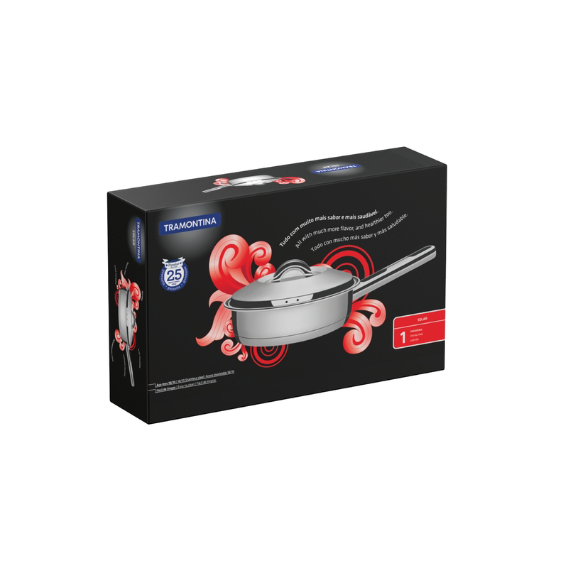 Transforme sus recetas favoritas en creaciones exclusivas con el Sartén Tramontina de Acero Inoxidable Fondo Triple con Mango 24 cm de diámetro 3.30 Litros. Puede ser utilizado tanto en la cocina como en el horno, usted puede explorar su lado chef y preparar platos llenos de sabor. Su fondo triple (acero inoxidable + aluminio + acero inoxidable) hace que el calor sea distribuido uniformemente, garantizando una cocción rápida y uniforme. El sartén de acero inoxidable de la línea Solar transformará su día a día en la cocina con mucho brillo y sabor. Totalmente confeccionada en acero inoxidable, no suelta ningún residuo en los alimentos, manteniéndolos sanos. Su diseño limpio y sin bordes facilita mucho más la limpieza. Se puede llevar al horno para gratinar o finalizar platos, a una temperatura máxima de 260°C. Formato funcional para preparación de los alimentos. Terminación en alto brillo. Se puede lavar diariamente en lavavajillas. Se puede utilizar en cocinas: a gas, eléctricas, sobre vidriado cerámico y de inducción.