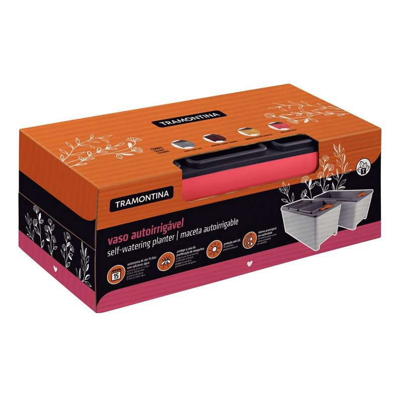 Quienes aman la jardinería, saben la diferencia que hace una buena maceta para las plantas. Por eso, desarrollamos la maceta autoirrigable triple Tramontina de polipropileno 10,5 litros. Fabricada en polipropileno y con tres compartimientos separados, es perfecta para plantar flores y hortalizas de forma independiente. Por ser autoirrigable, la maceta solamente precisa que el compartimiento del agua esté abastecido para dejar tus plantas siempre hidratadas. Fabricado en polipropileno de alta resistencia, que proporciona más durabilidad y excelente terminación. Volumen de la maceta: 10,5 L. Capacidad de almacenaje de agua: 6 L. El producto tiene aditivo de protección contra UV, que le garantiza alta durabilidad y protección del color. El sistema autoirrigable por capilaridad, que dispensa el riego diario, aliado a una capacidad adecuada de almacenamiento de agua, le otorgan excelente autonomía de irrigación a las macetas, facilitando el cultivo y garantizando el crecimiento sano de tus plantas. Se puede utilizar tanto en ambientes internos como externos, porque es resistente al sol. No ofrece riesgo de pérdida de agua y además protege la casa contra la proliferación de mosquitos. Autonomía de hasta 15 días sin añadir agua
