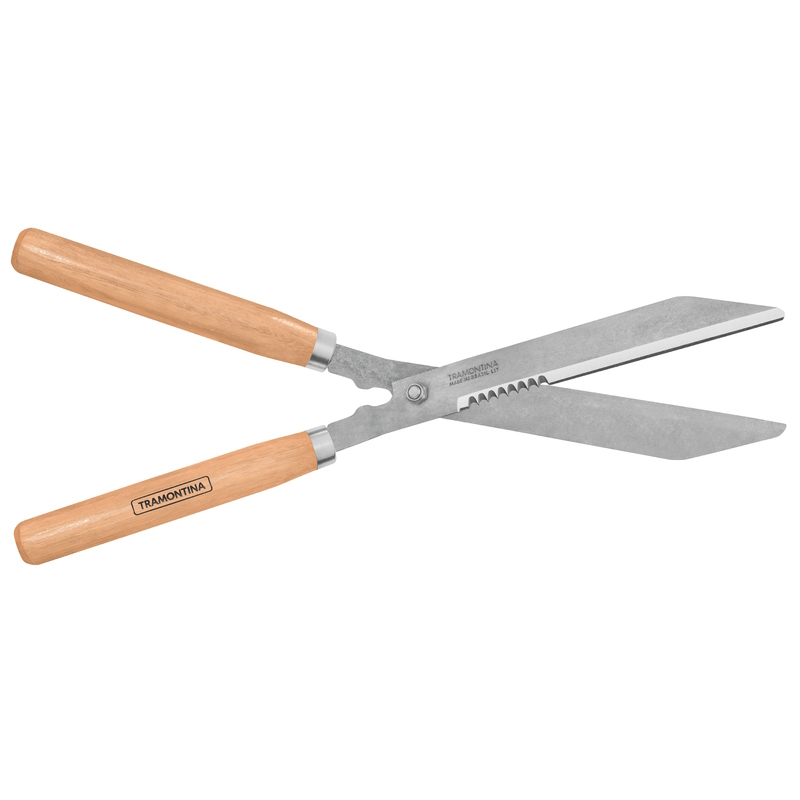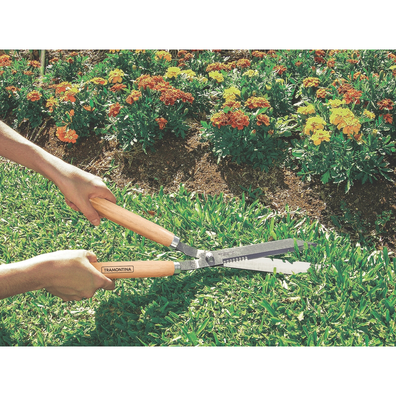 Un jardín con hermosas plantas, césped, cerca viva y flores le dan aquel toque bonito de naturaleza en nuestra casa, pero exige mantenimiento. Y para que consigas apreciar todos los beneficios proporcionados por esas lindas plantas, hay que tener una herramienta adecuada para emparejarlas. Por eso, precisas conocer la Tijera para Cerca Viva Tramontina con Lámina Dentada Metálica y Mango de Madera. Su lámina dentada de alta calidad va a facilitar el corte o desbaste de los arbustos y del césped. Y si tienes talento artístico, podrás utilizarla para topiaria y dejar tu jardín con los más variados formatos de corte y terminación. Con ella, tu jardín va a quedar mucho más bonito. La tijera es templada en todo el cuerpo de la pieza, proporcionando más resistencia y menos desgaste durante el uso. Láminas con dientes fabricadas en acero carbono especial de alta calidad. La lámina dentada permite cortar pequeñas ramas. El afilado de las láminas se hace con máquinas CNC, proporcionando excelente durabilidad del filo y un corte más preciso y suave. El mango de esta herramienta, además de tener excelente resistencia, se fabrica con madera de origen renovable. Mango con terminación barnizada para una mejor presentación del producto. La capa protectora de barniz incoloro realza su tonalidad, concediéndole brillo y un toque más liso al producto. Liviana y práctica en el uso.